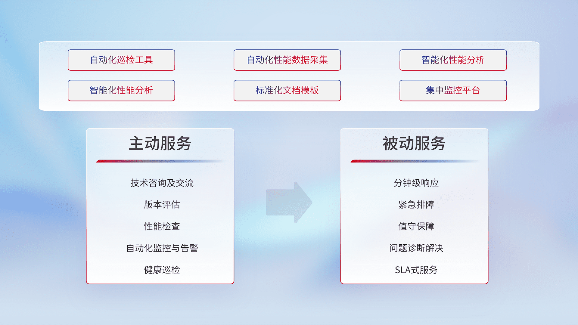 智能化工具和标准化文档,,,,保障服务质量,,,,提供主动服务(包含技术咨询、、、版本评估、、、性能检查、、自动化监控与告警、、健康巡检)和被动服务包含(分钟级响应、、、、紧急排障、、、值守保障、、问题诊断解决、、、、SLA服务)。。。
